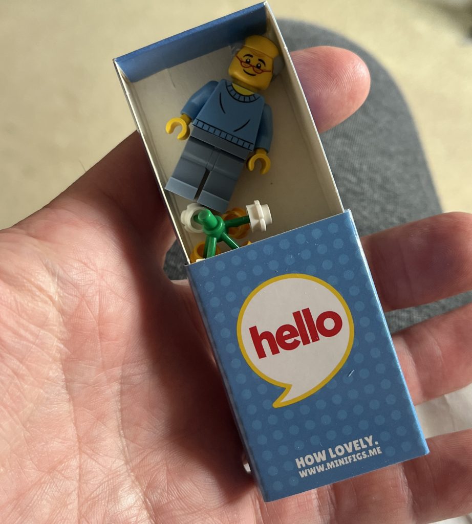 My father’s birthday has come upon me and I wanted to create a fresh present, and something that was unique to him. Steph had already said about making a Lego-based diorama, and I had an idea that used some of my surplus minifigures. I found the frame on Amazon, it wasn’t cheap, but much of what is used for displaying Lego, is more often than not, expensive. Pulling it all together, Steph set about getting a figure of my Dad, made. She decided to use minifigs.me. It arrived very quickly, and in a lovely matchbox style of presentation.