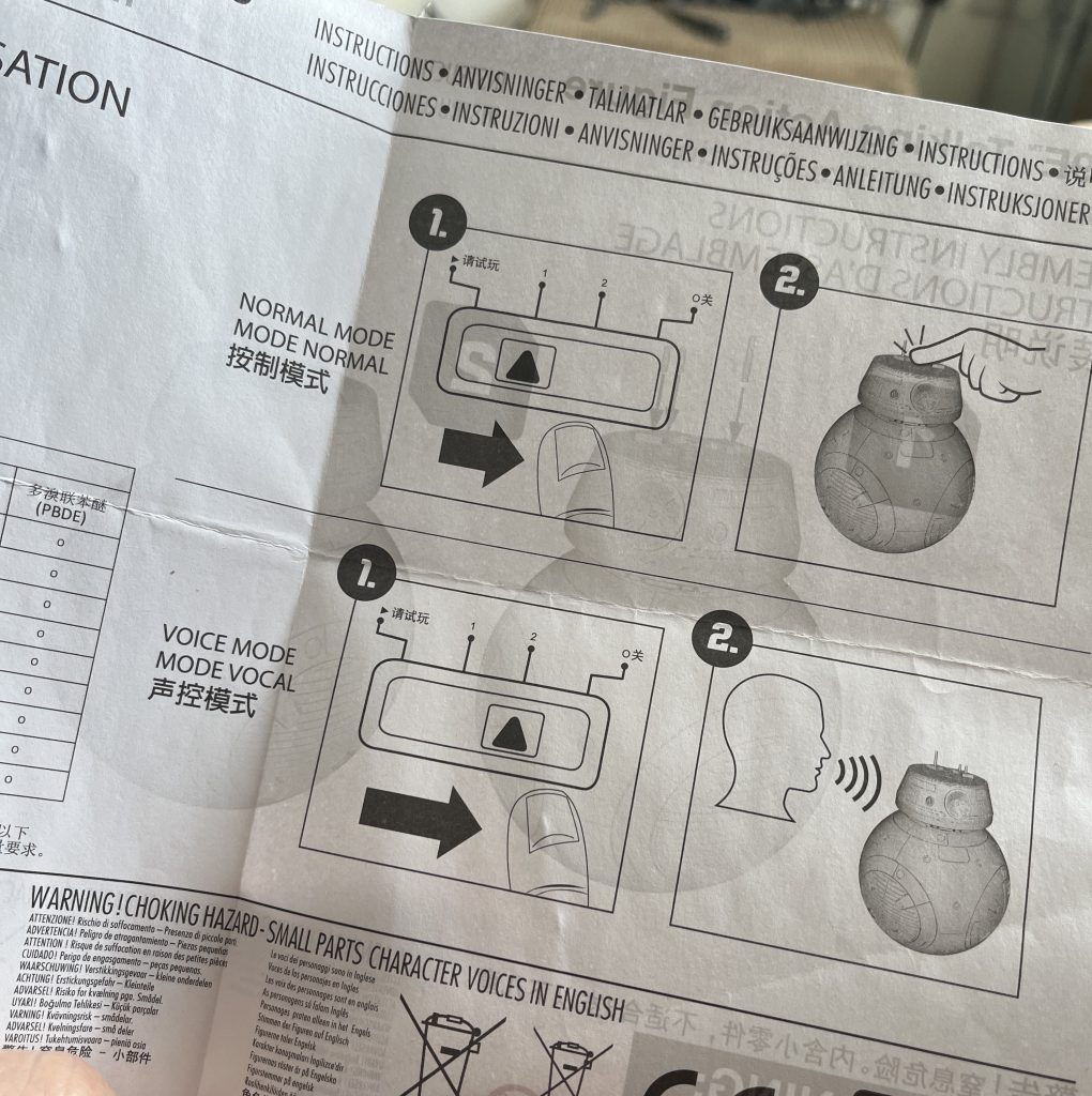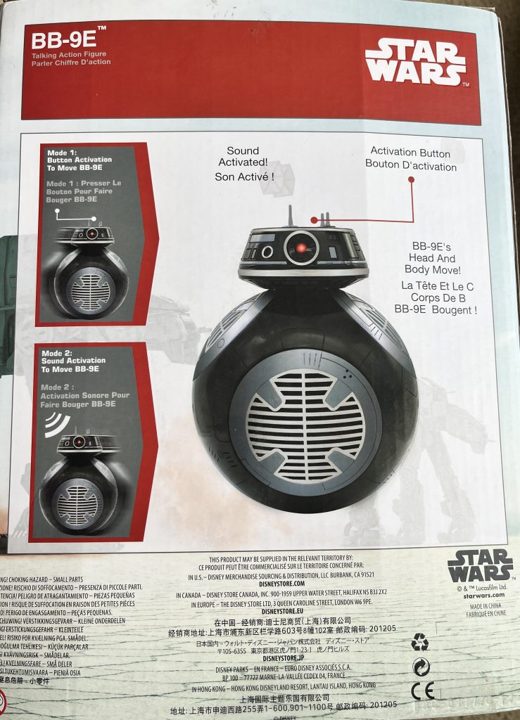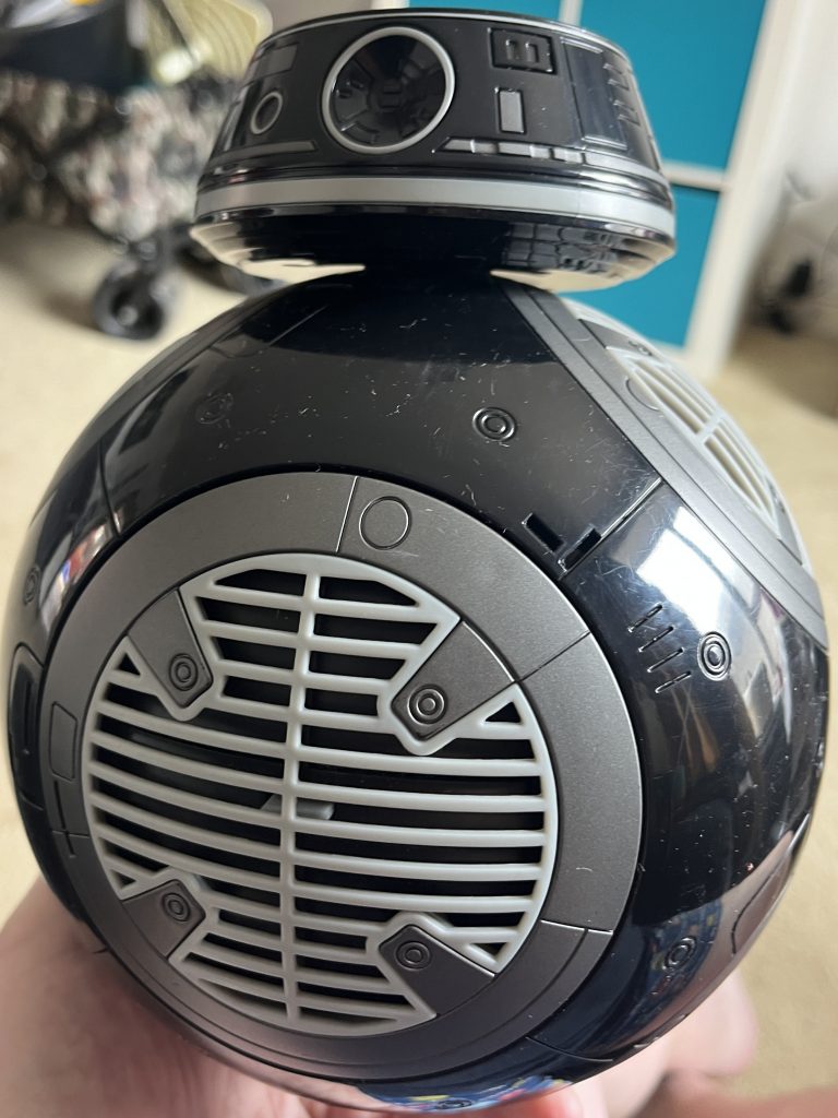 It’s another beauty from the charity shop, or so I thought. The overall presentation of it, is nice. Its weight and build quality is not bad, either. Where it lacks, is the features are not as impressive as you would hope. I have a Sphero BB-8 with an app link that allows you to move it around. On its original release it had a dedicated app that gave sound effects and logical tasks. Although I didn’t expect this much from the BB-9E, it is very much lacking.
