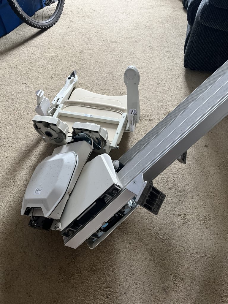 Removing it from the stairs was easy, it was pulling the rail apart and getting the awkwardly heavy seat out of the door that made it difficult. I cannot explain how much weight is in this unit, but a huge sigh was just heard coming out of my mouth! I am going to repurpose the amazing motors and keep the aluminium rails for another time. The rest will be thrown away, sadly. It was to be kept for use by someone when they needed it, but two things are now apparent: