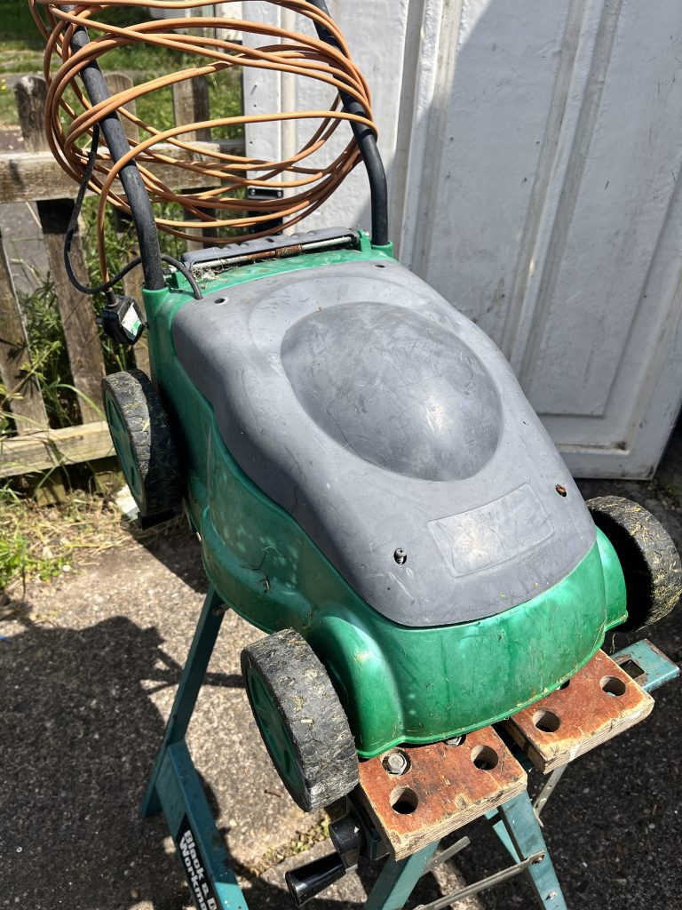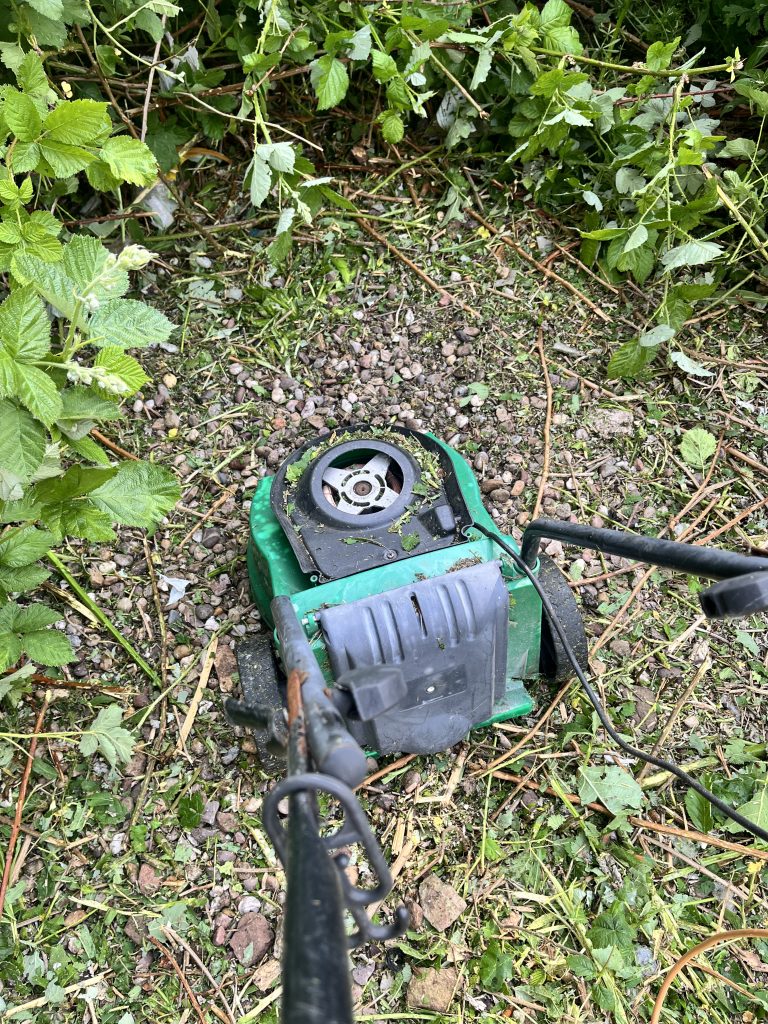 Currently, it has gotten out of hand, and I needed to up-the-ante. Seeing an old, electric, lawn-mower, in the corner of the garden, I set about cutting the front off to create a ‘striker’ system. Using the front edge of the blade would act as a weed mower, thus the name.