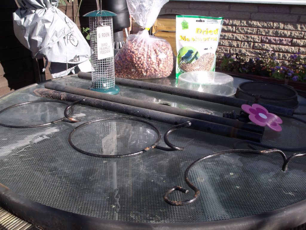 Firstly, I needed to resurrect an old feeding-stand that was in the corner of my garden. I sprayed it up, making it all neat once more, and began the outfitting of the plastic saucer that is a part of the feeding platform. In FIG1, you can see the newly sprayed stand, drying on the table. It was a little rusty on the surface, and I thought that it needed to be given a new lease of life for the camera.