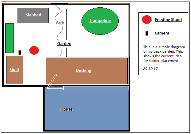 It is important that we consider a few things before starting. The immediate check, is where to position the stand. It can’t be close to a fence, as this could trigger the local cats into thinking there is a new restaurant close by; it also needs to be considerate of the camera. Thought must go into its visibility to thieves, but also give a clear view of the testing space. The image, below, shows the garden outline and the position that has been decided.