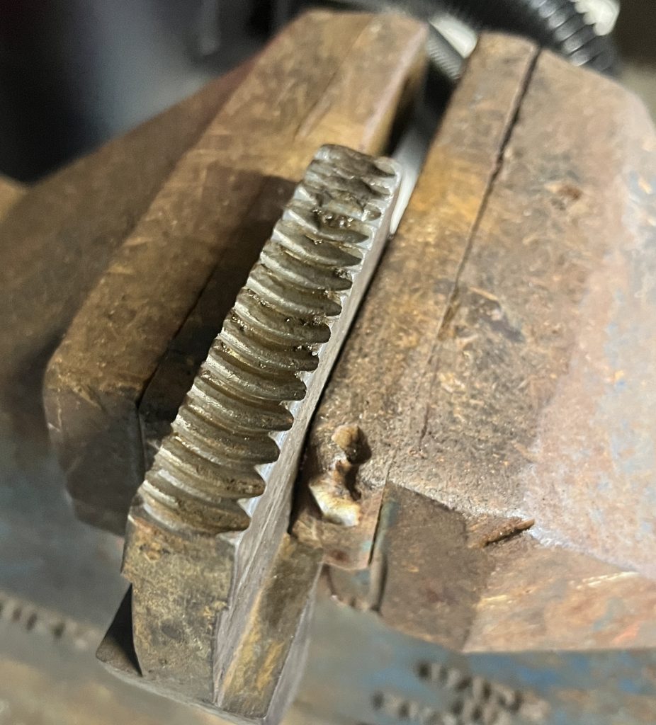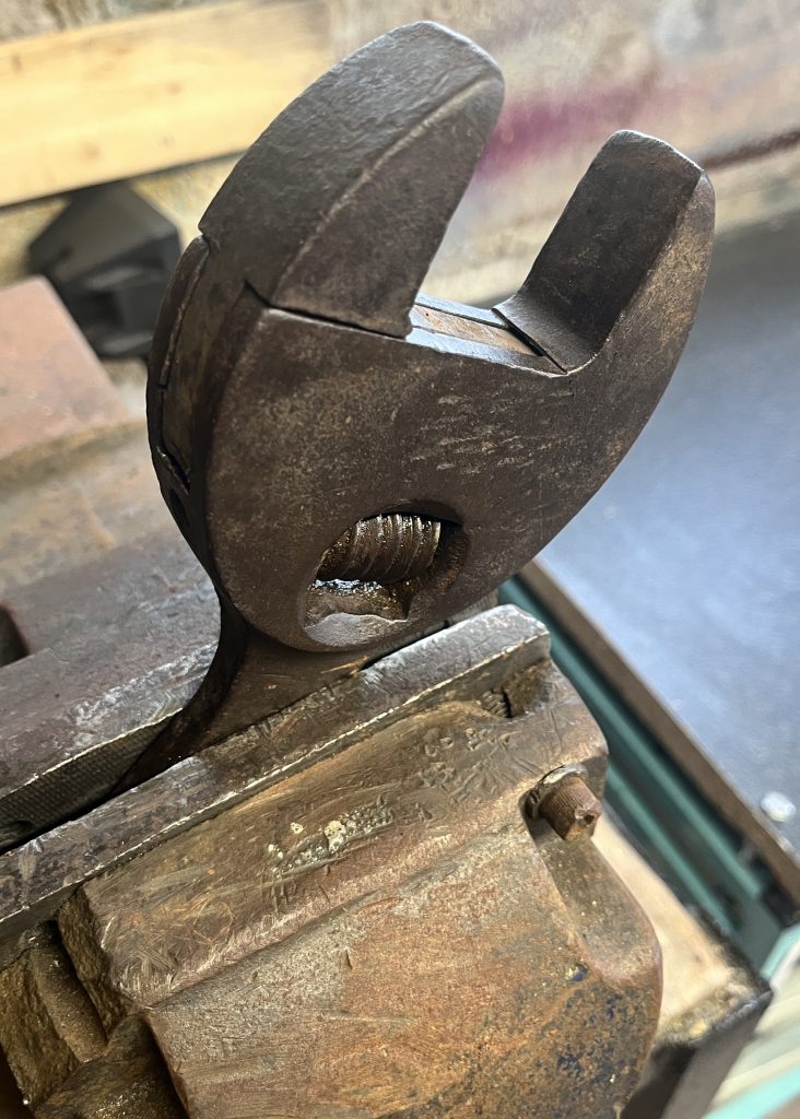 The time finally arrived, the big adjustable spanner was to be refurbished. I had picked it up at a charity shop, six months ago. You could see that it was a handmade tool, likely made in somebody’s garage. It was stiff and the teeth were getting stuck in place, so it needed to be taken apart. I tapped and turned it until it came free, sliding out of it’s seat. I was then able to wire brush the teeth and get the grubby oil off of them.