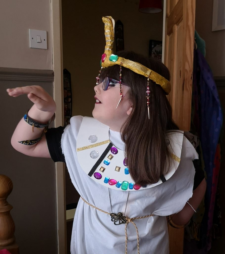 School projects can cause much amusement when prepped at home. Parents are tasked with creating intricate costumes and accessories. In this case, 2019’s project was all about Egypt. We were given the idea to create a great Egyptian Princess costume, with a labelled pyramid to back it up.