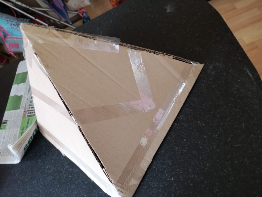 All work was done by hand, utilising the creativity’s best friend, paper-mache. The pyramid was constructed with cardboard and covered in squares of old, brown, sugar-paper. The block design worked great and was down to my , very, creative, late wife. You can see in the images that the project was relatively cheap and used a lot of bits from the craft drawers. A great idea is to get tester-rips of wallpaper. The right design can create a block or brick finish with ease.