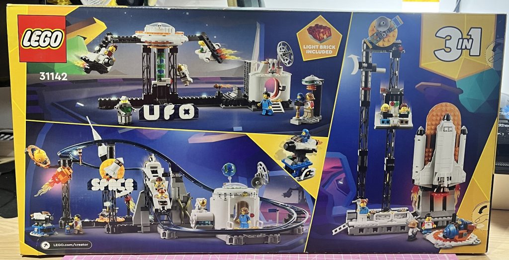 To start, I want to say that I am going to write this in a similar fashion to the Upscaled Santa figure’s post. I want to go with the bag-to-bag descriptions. I have had this set for a while. I could see that it would have a large footprint, so wasn’t sure how to display it. The new display cabinet should be fine, with the top of it being my backup, as it is larger than the shelves. When I was young, I used to make theme-park rides, making the best of the blue Lego track available to me for rollercoasters. This is a dream come true, with the other two options in this 3-in-1 not having a chance!