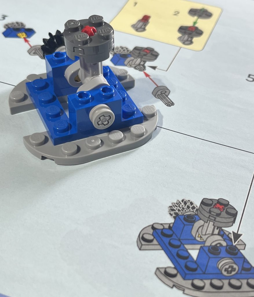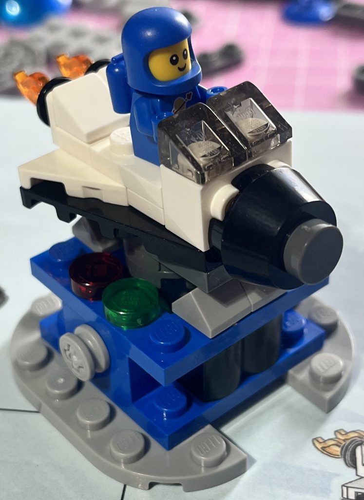 The opening bags have the father and his space child to begin with. This is when you start to build the small shuttle on a kids coin-op ride. The mechanism is great; twisting the gear makes it rock back and forth. The idea is for the space kid to enjoy a ride, but without a single scaffold 1×2 plate, it can’t stick to the ride, making him, or her, or them, just slide off! I wasn’t sure if I would need a ground plate to sit this on, but the overall strength of the base is quite impressive. This part of the build is somewhat basic, really.