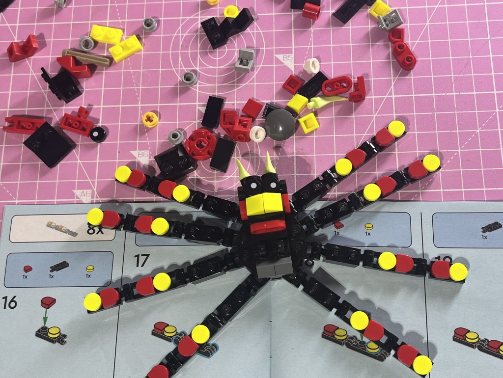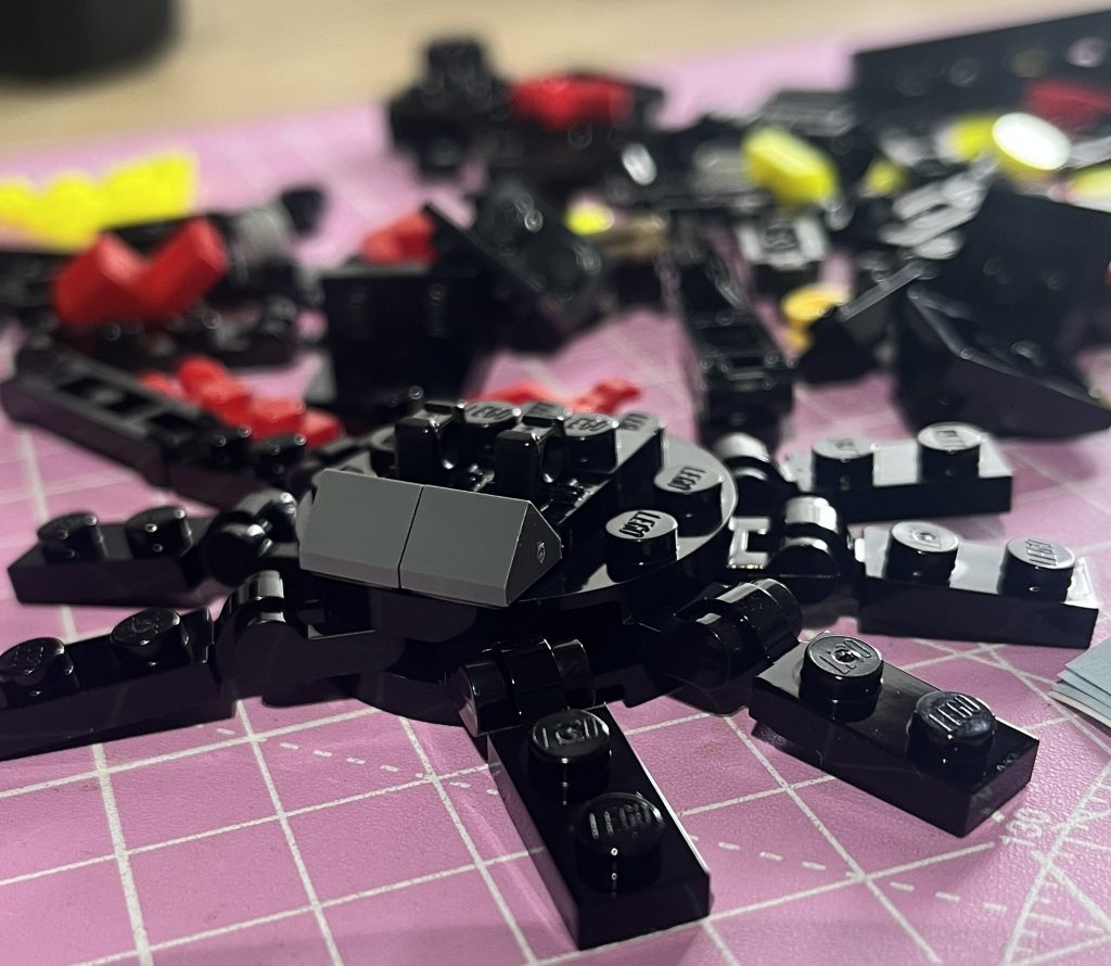 Plastic bags are given, in this set, so no pappy bags. There are no stickers, though, though I doubt there would be anything in need of a printed block, besides the eyes. Opening the bags, you can’t miss the looseness of the pieces, of which there are many fiddly items. As expected, you start with the abdomen and build up the legs. Seeing how there are eight of them, it’s quite obvious that that means building the same section…eight times! The colours are fabulous, and that is apparent straight away.