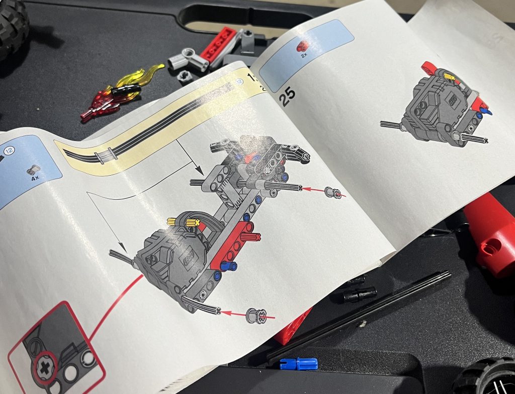 I found this set, months ago, and thought it was about time to build this little pull-back dragster. There is no steering, but it does go fast in one direction! The troubles with this set was the folded up instruction booklet. This can be a nuisance as you try to change the pages with one hand. Overall, there was always a chance that this would be missing parts, like always, but in this case, they were all there. It was quite clear that somebody had started it, but gave up very quickly! Even though the pins were in the wrong holes and the pull-back unit was the wrong way up, it was easy enough to build when pulled back apart.