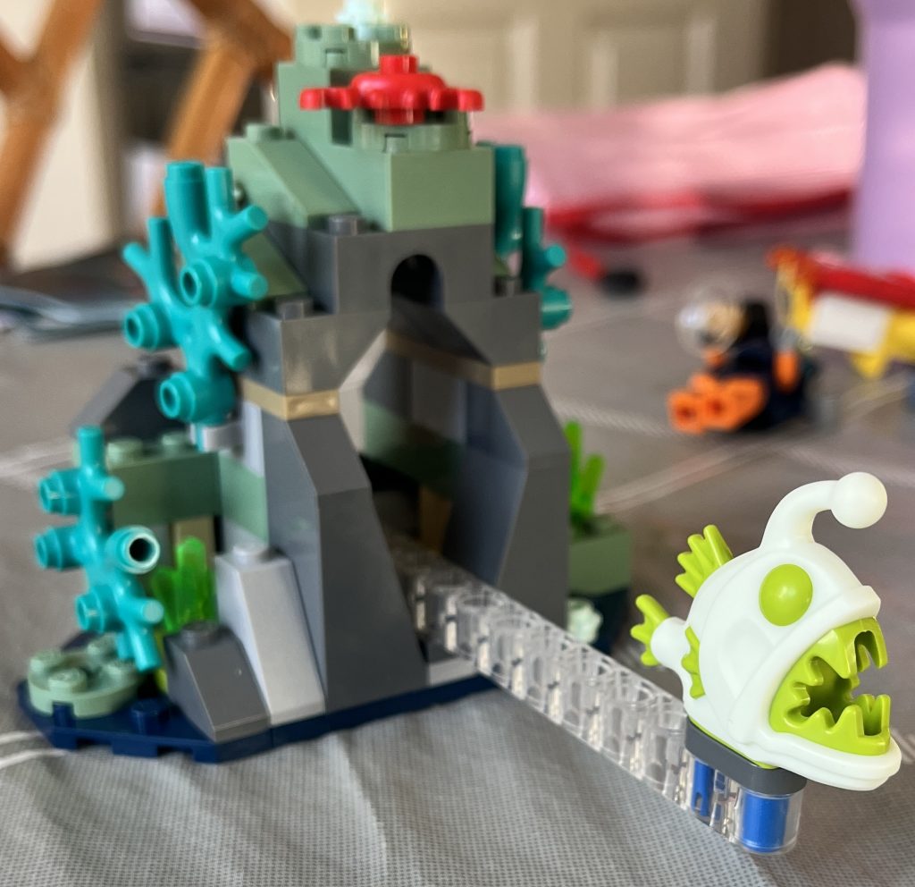 This is the second to last of the bagged Lego sets that I found at my local charity shop. I am always keen to get my hands on the ocean sets, as water is a key part of my own life, and so enjoy the build of vehicles that mimic my own loves. To make a start on this post, I want to say that it was missing three parts, of which I found from my own piece-population, so in this case, it wasn’t too much of a hassle. The overall quality is great, as a playset, it is brilliant, having some interesting pieces and adding a new creature to my plastic menagerie. The Deep Sea Angler Fish is on a transparent Technic bar and can by rushed out of its rock-face-hideaway. You can then see why the submarine-pilot has such a scared look on his face.