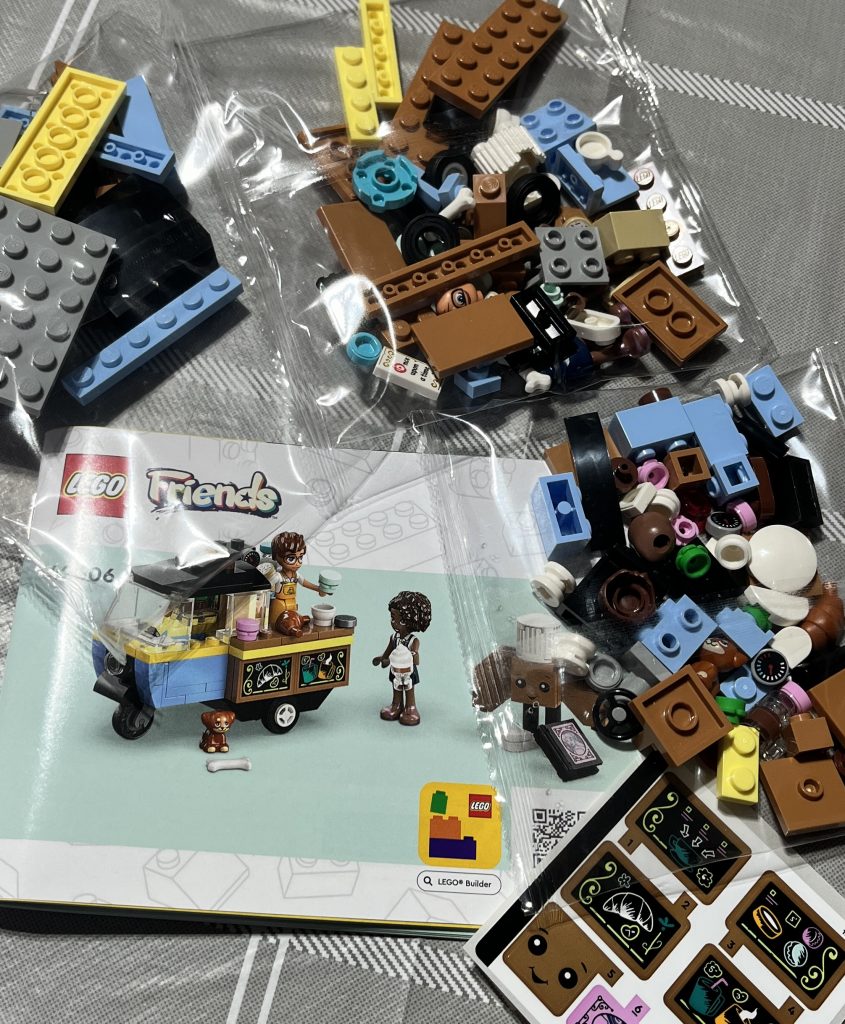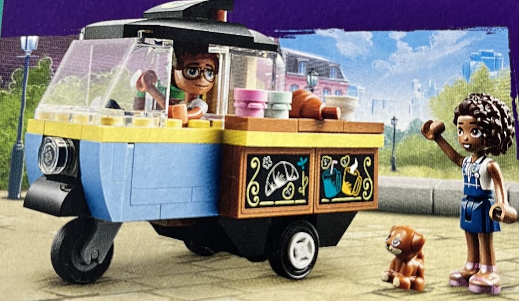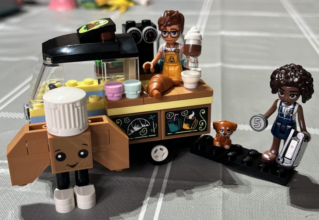 Now that I have looked closer at Friends sets, I have a grown fondness for them. I have spoken before about the colours and the positivity that they offer. I wanted to build a small set and thought about getting this £8.99 bakery on wheels. In all truth, I was taken by the funny croissant on the box! Like all sets, this one has its quirks, with the most interesting bit being that the cream-topped hot chocolate has a pre-moudled drink, in it. I was surprised that such a small set would have two minidolls. I know that their popularity is not as a minifigure, but even these are now growing on me.