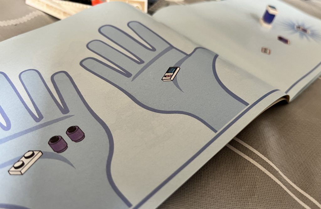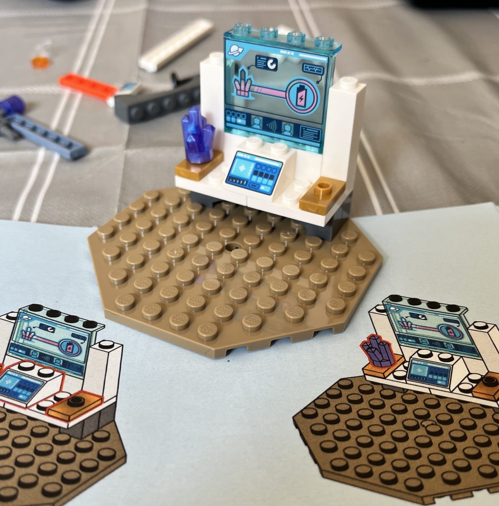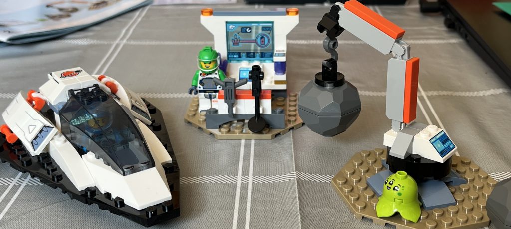 The build begins with the shuttle. It’s a micro version of the one in a previous build, and houses the first spacefigure. It goes together with ease and is a great pleasure to work on. The second bag holds the control panel and crane. It’s great to see the asteroid pieces back in use. Once built, you can fix the included metal-detector and jack-hammer to the front. There is the usual battery cells, with the control panel showing that it is a charging station for them. This shows a small story aspect to the whole new aesthetic.