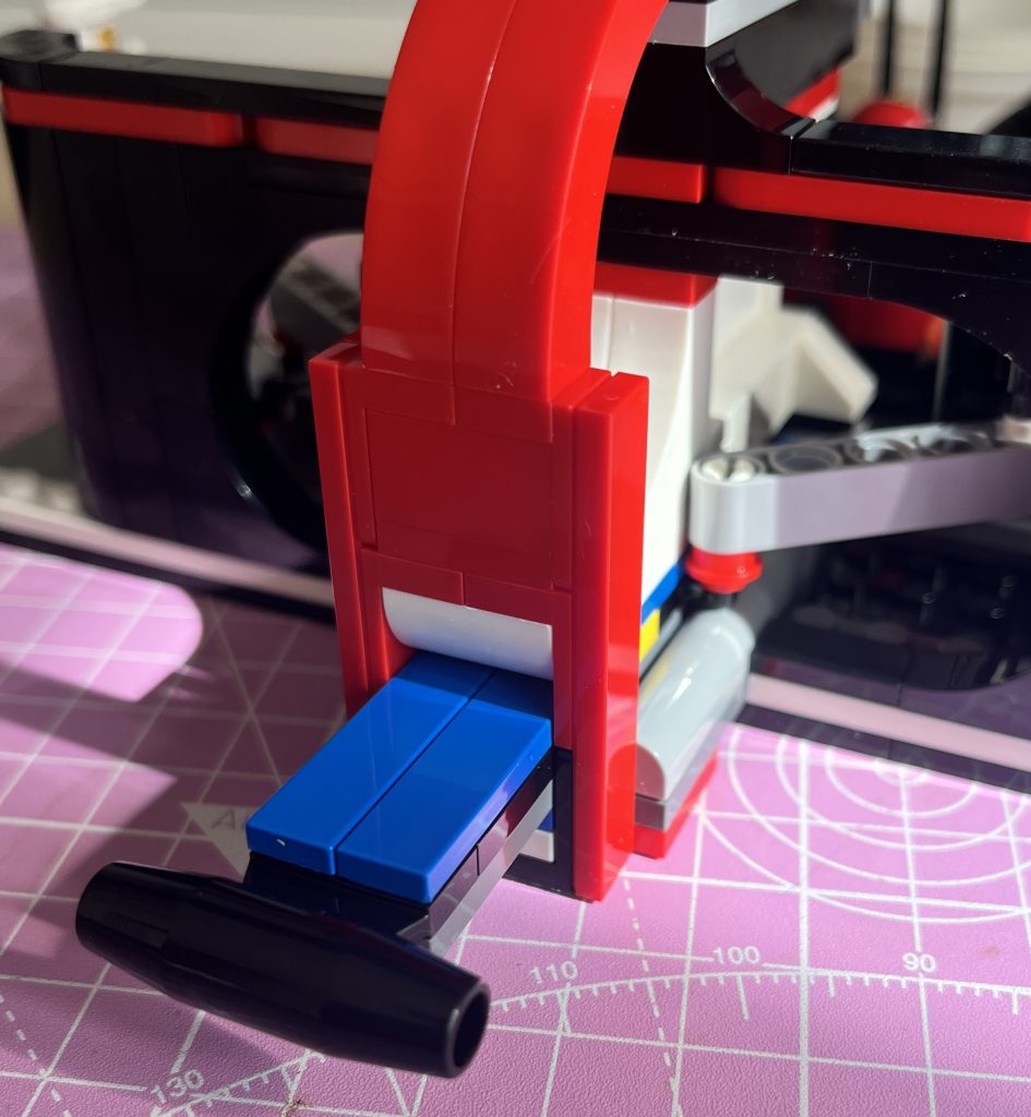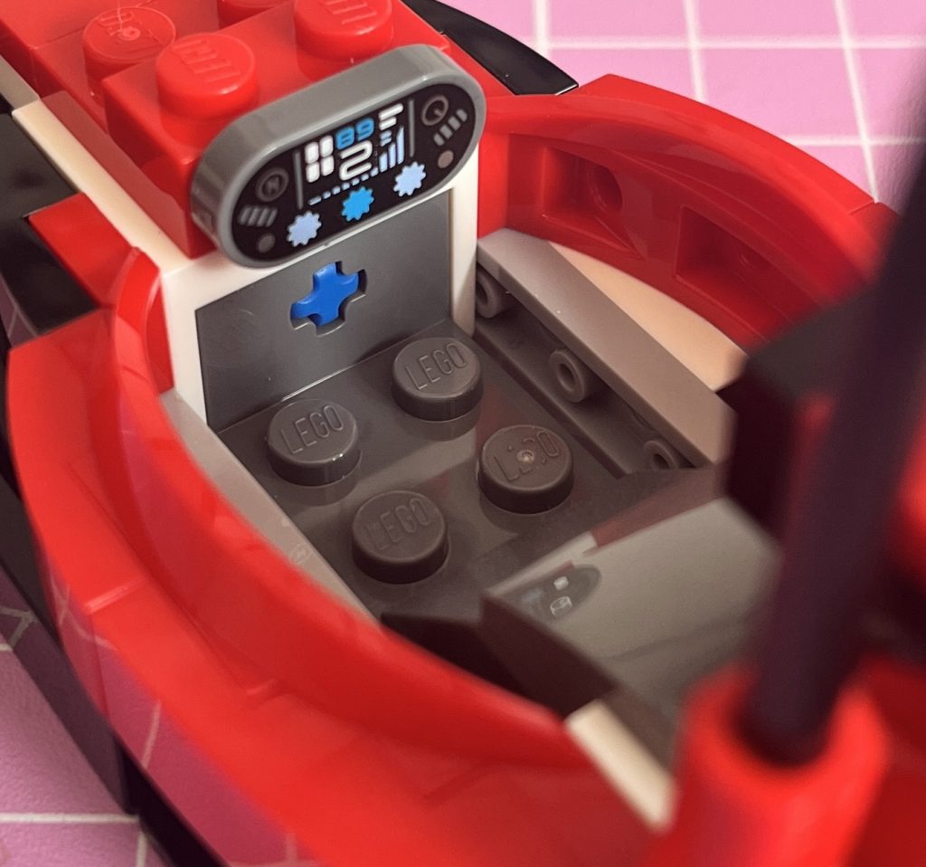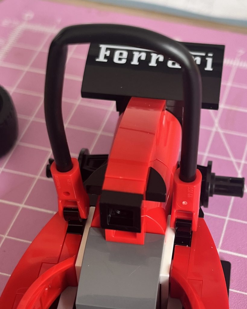 Opening the box, it has stickers inside, my first gulp of the build was made. I loved the amount of red and black that was used throughout, making it a truly Ferrari piece of kit. Bag one is all about the car. Even though it’s a simple build, there are some great choices by the Lego team. One thing that annoyed me, was the tubing used to surround the vehicle’s occupant. It folded, rather than bended, so I had to improvise and create a second kink to make it look squared off. This solved that issue, so I wasn’t too bothered, beyond it. The curves and colour choices make it look like a genuine model and I can see Lego adding more to this range. I would love to see a Williams Pit Crew set, next!