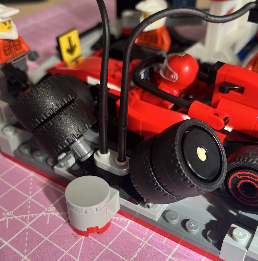 Bags two and three built the pit area. I love how it has a solid crew of four and that by pulling the lever behind the setup will close the barricades for them to change the wheels over. You might also notice that there is a second set of wheels with patternless centres. This is a great way to keep sets together and offer the experience of a quick change. I remember as a kid loving removing wheels, changing them, repairing the vehicle. This is just magnificent. There are screen that are where the stickers are used, but I love the use of the the equestrian tools for refuelling tools.
