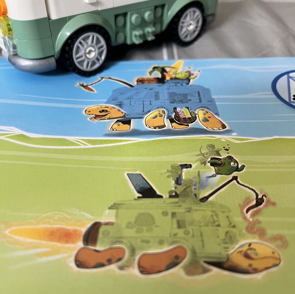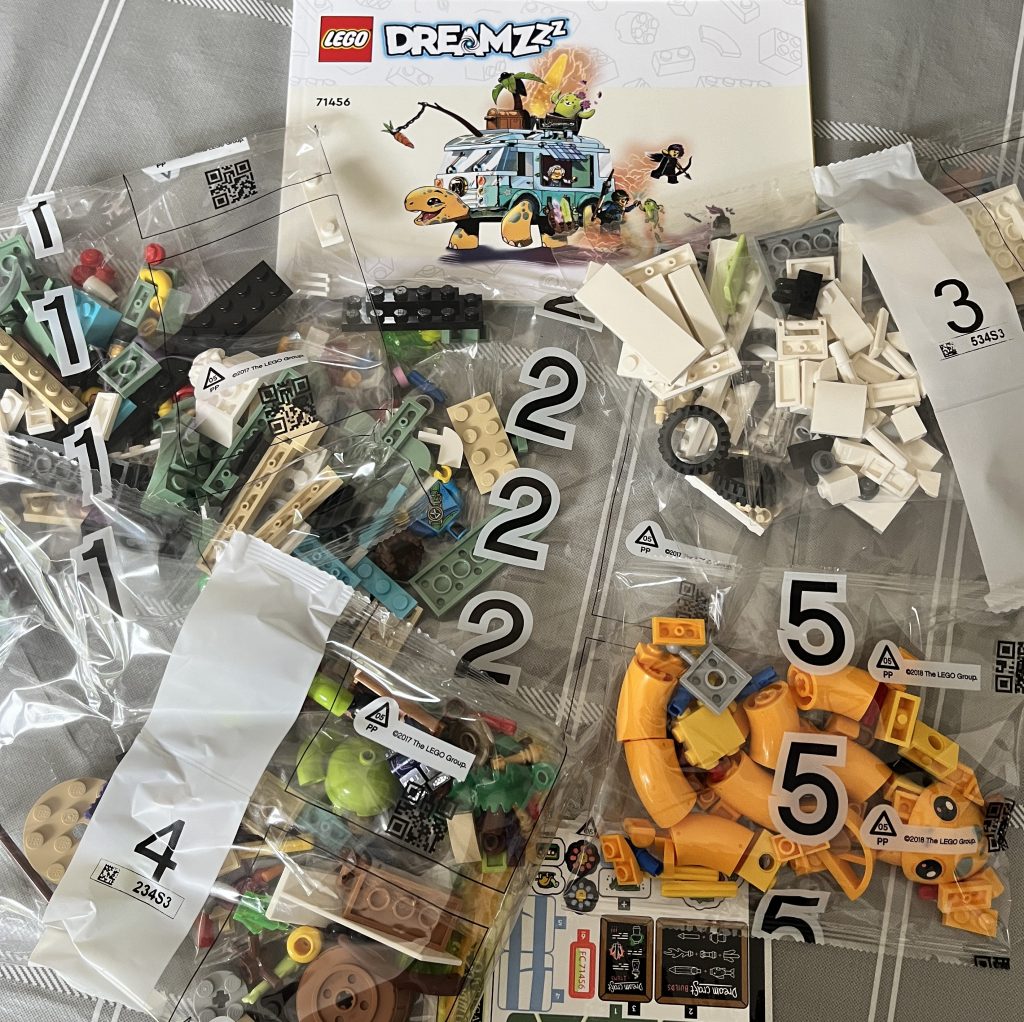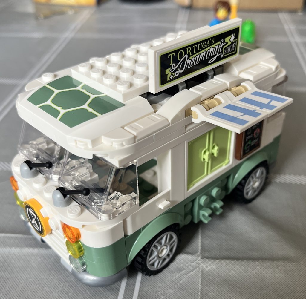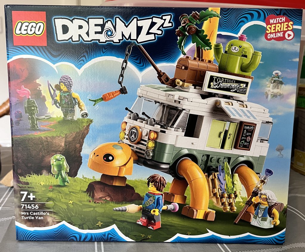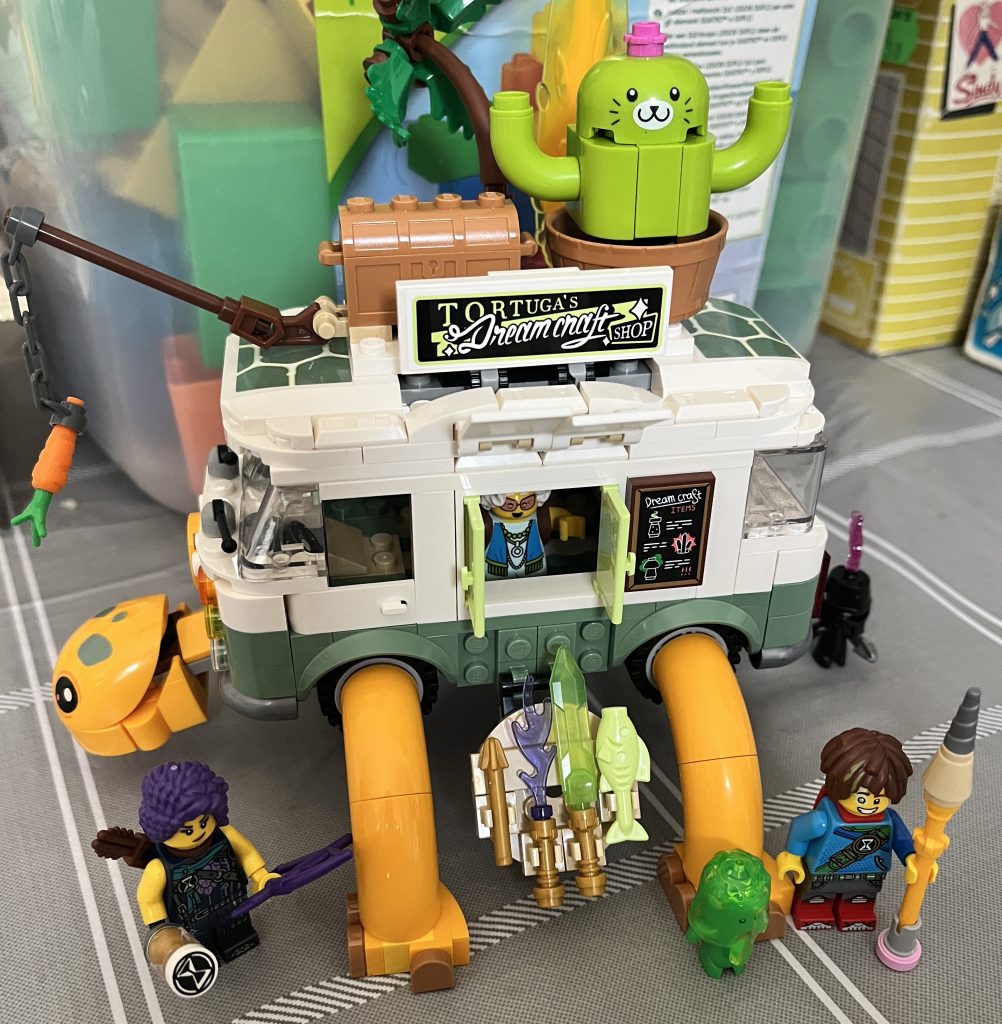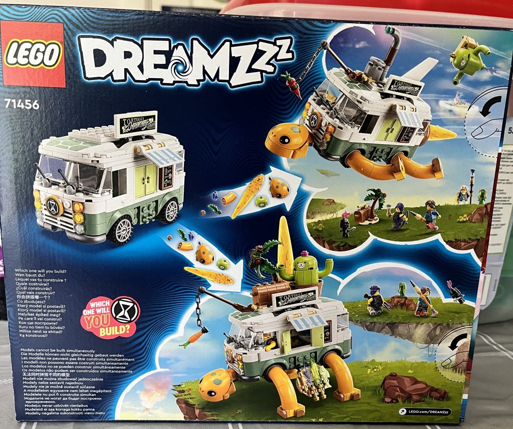 It’s another one of these fantastic Dreamzz sets. The artwork never fails to astound me. This particular set has a thick instruction booklet with three options for the end product. The first is that of a closed van. It can be used like any other Lego vehicle, and even look like a fun addition to your city-scape. The second and third come together. One being the way that I chose to go: A walking bus with tacos to sell. The second: A boosting turtle with flames jetting out of the back.