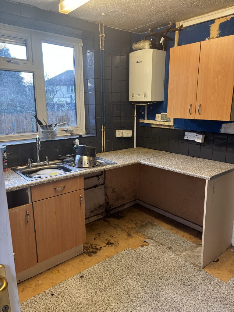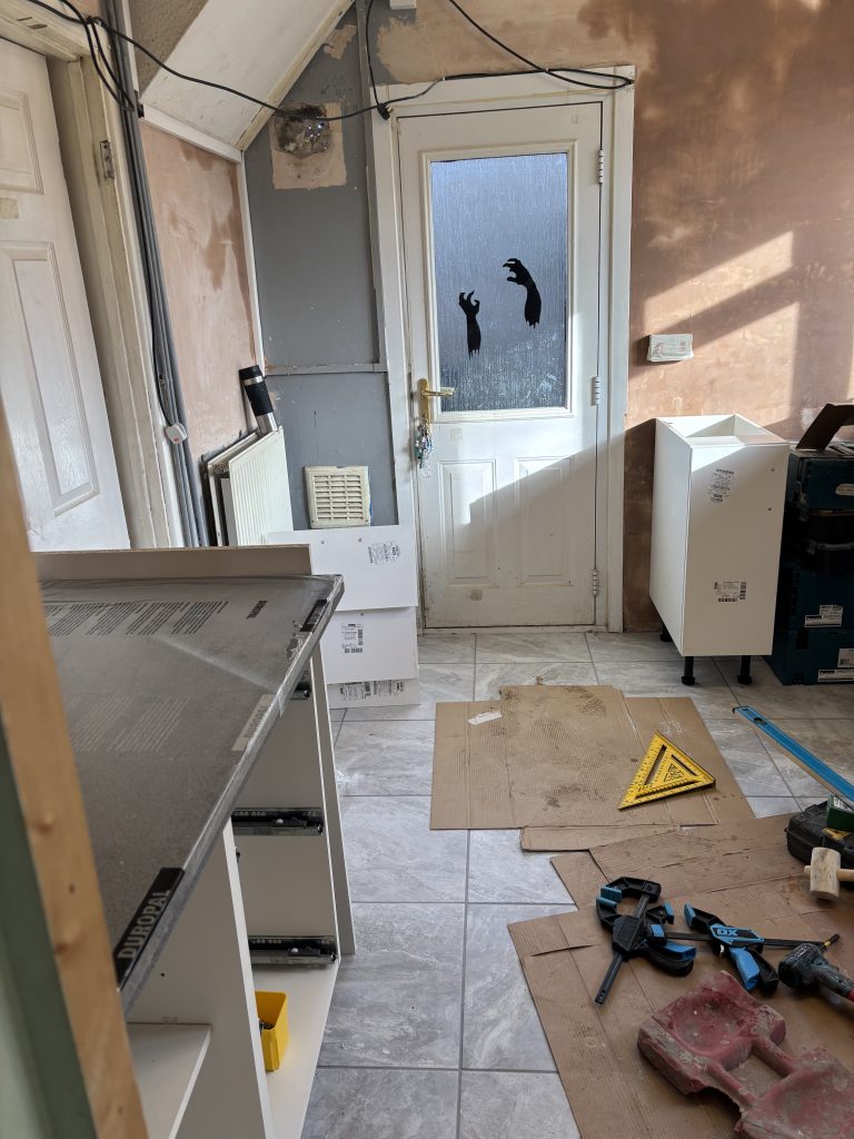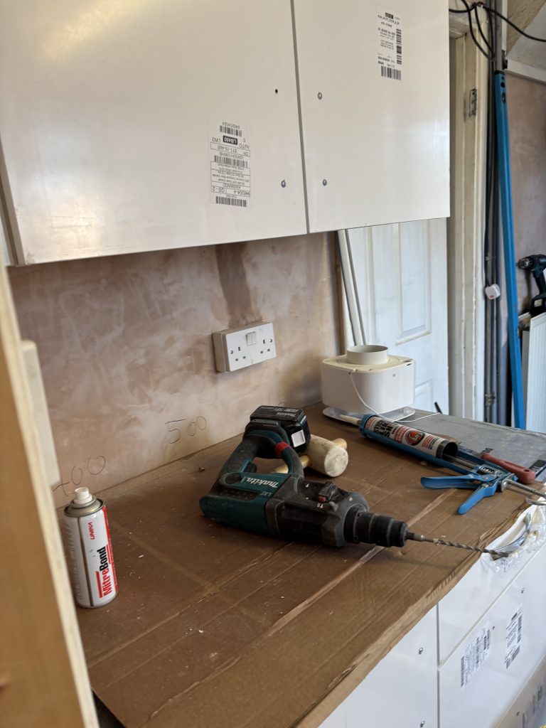 Monday: The first two hours was a case of ripping out the old. The units were thjrown out and the tiles smashed off of the walls. The electrics are tidied up and a new socket fitted to the upper wall so that I cooker-hood can be installed at a later date. Plaster is reskimmed on the majority of the walls.