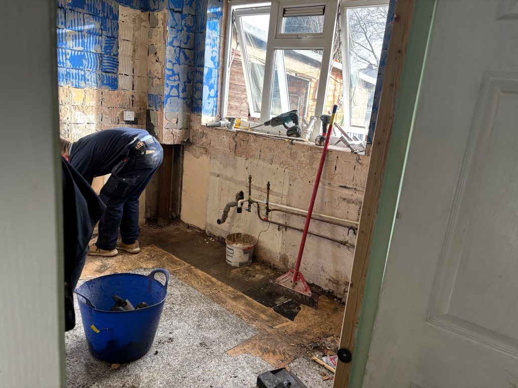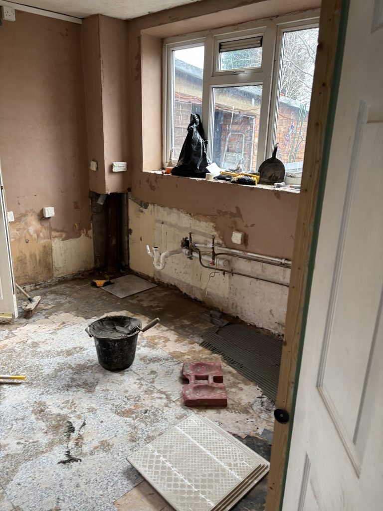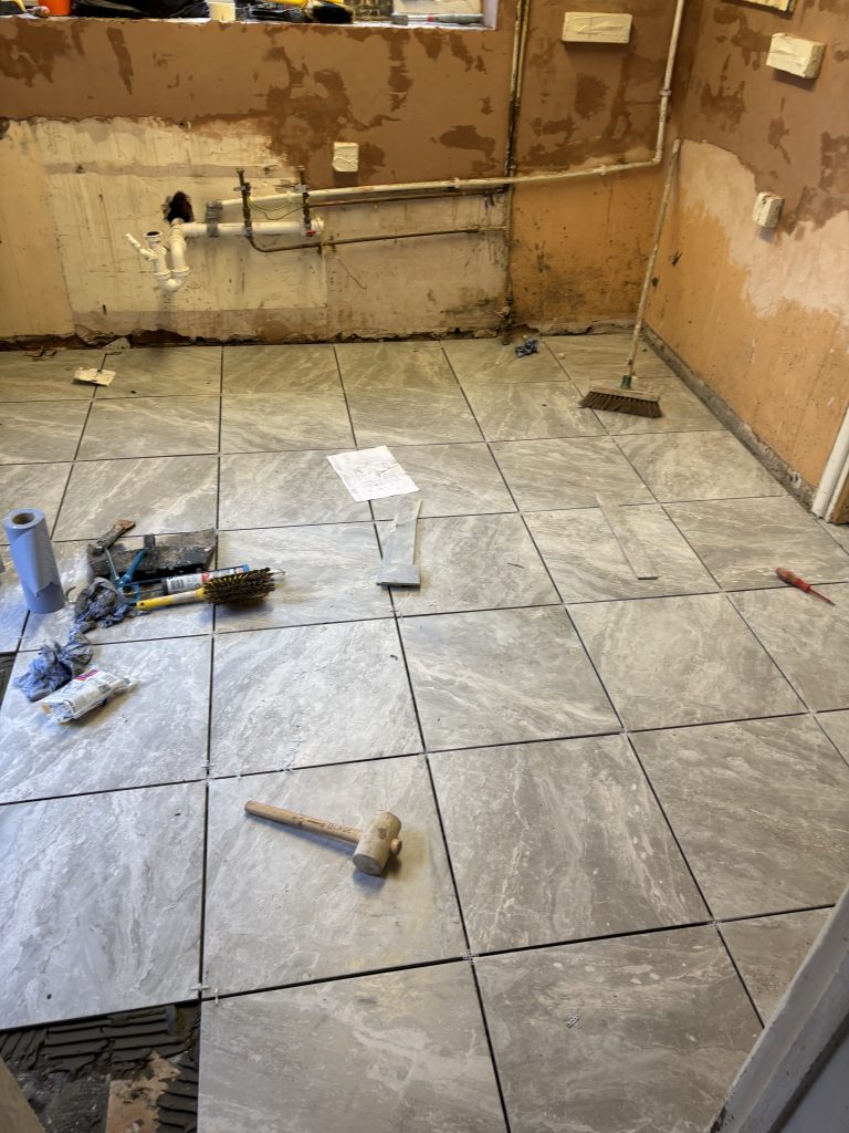 Tuesday: The walls are filled and the electrics are finalised. The floor is cleared ready for the tiles and they begin being laid.