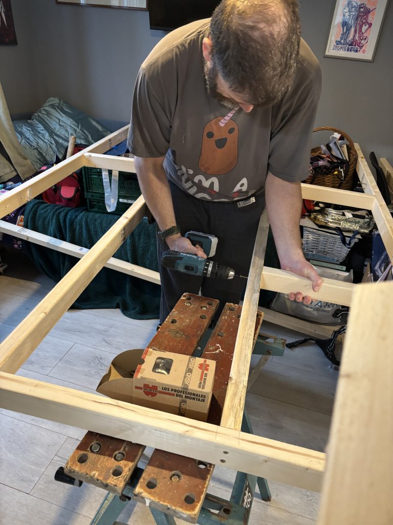 Phase One – Wall Frame: As the dining space is quite large, we placed a bed in the corner and realised that we could use 1/3 of the room as a sleep and safe space. I bagan by creating a frame that the plasterboard could be attached to. The trouble was fitting the door. We decided to use one of the double doors that we took off the dining/lounge divider. The width of this helps to make the best of the space that was available. After a debate, I used five screws to pin the bottom bar to the flooring. This could be filled in once the wall, eventually, gets removed. and easy ceiling meant the screws could just be placed in the top bar, and the dwangs were fitted in before the frame was placed. I added a small frame-section to fill out the space that cuts the window in two. I needed to chisel three of the connections between the top bar and the uprights. This is where the dead-blow-hammer comes into its own.