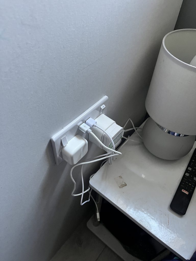 I completed the phase by adding the double socket on the inside room and covering the particular spots with scrap plasterboard. This is for safety and to make socket one sit in the wall. I did also tidy up the floor in there, and move the TV onto the wall behind the door. This was a good four hours of work, and has been quite the productive day. NOTE: The sockets are connected as an extension, only. They are all under the 13AMP maximum, for safety. Quite simply, they are attached to a plug, then plugged into a ring-main socket. Please DO NOT wire in sockets to the ring-main, yourself, get a professional to do it!