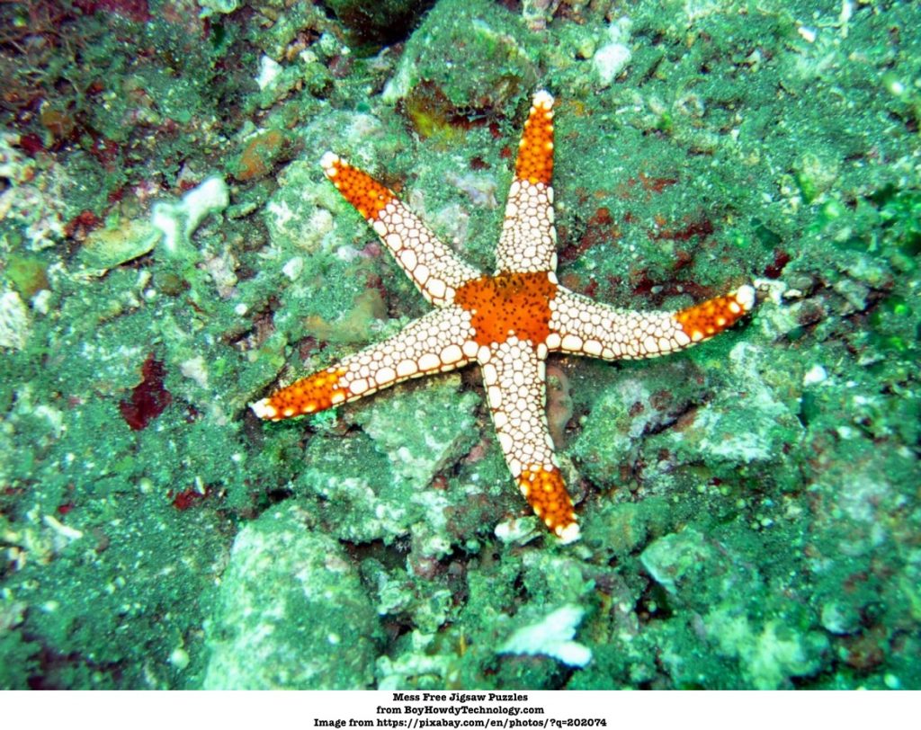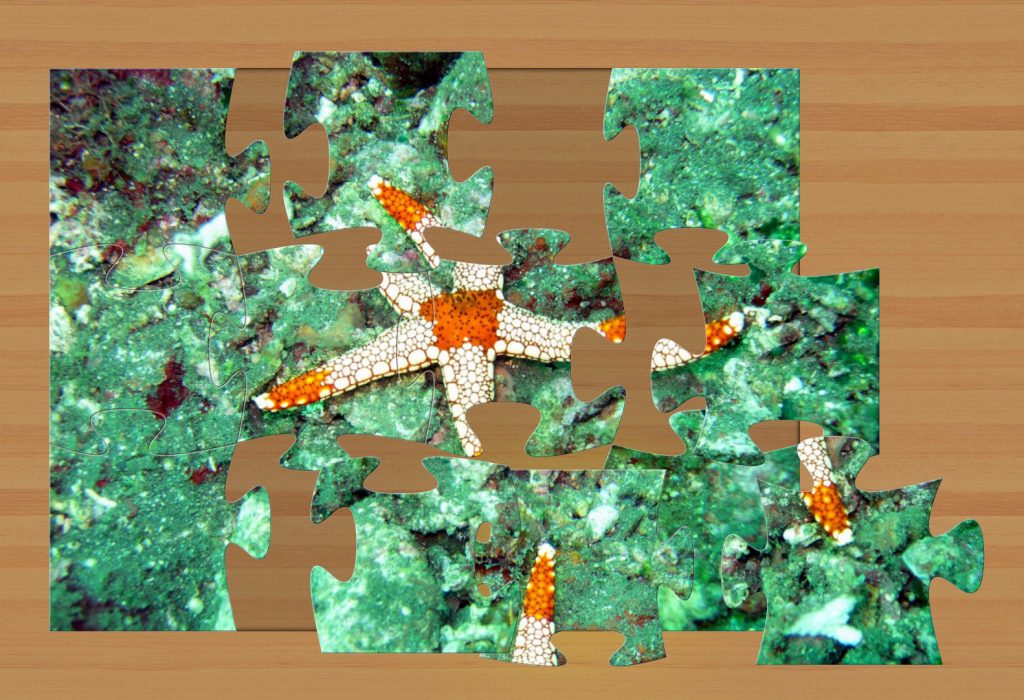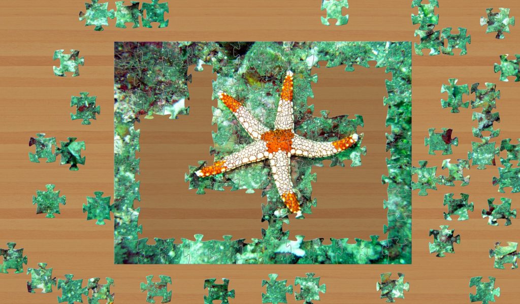 On one occasion, I chose 396 pieces and found it very difficult. However, when I tried the 100 peice on a larger screen, it proved almost as difficult as the tiny 408 pieces that I would later attempt. (See starfish image.). They were awash with colour and proved difficult for me to concentrate on one part of their surface. I found this strange, so I tried a 12 piece, and of course, this went together easily as the edges formed most of the picture.