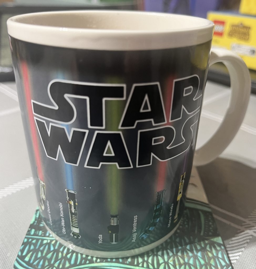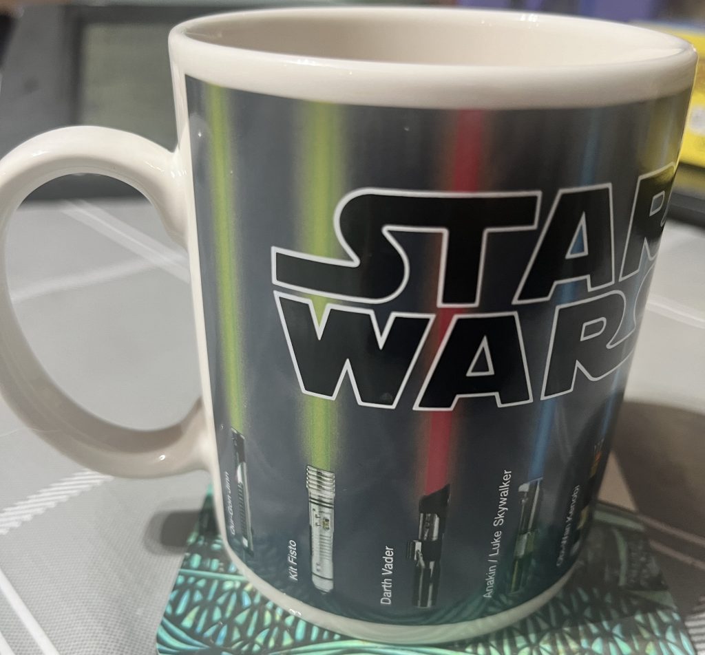 Several years ago, I was given a Star Wars mug by my neice. Over time, it peeled away, and I was annoyed by it. Its design was epic, the heat of the boiled water would make the blades of the lightsabres, ignite. If you watch it, you can see them extend, just like the real (FX) ones. I have since found another one. I paid a grand total of, £1, for it, from the charity shop.