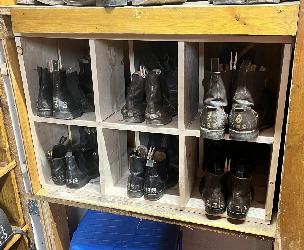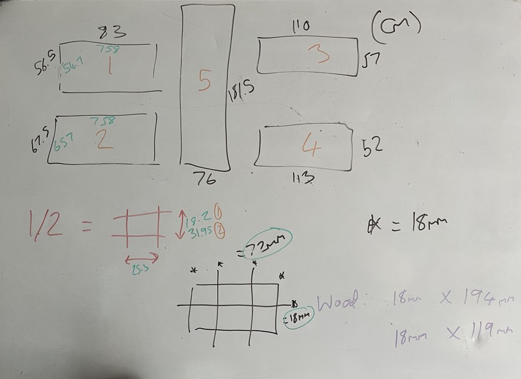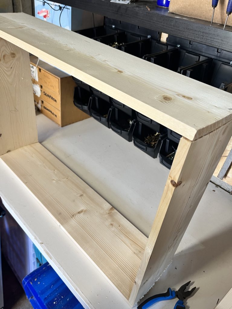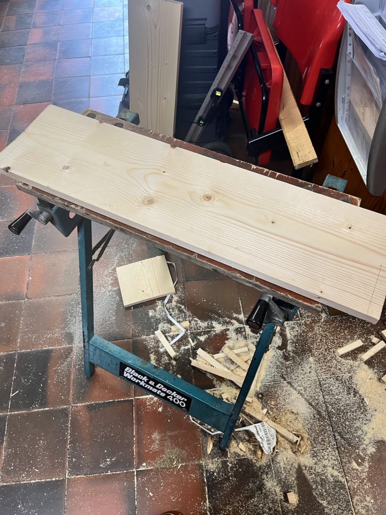 It finally became time to do some more on the Tack Room. I decided to try a different way of constructing the shelves, so an experiment was in order. The first few hours was spent building the two skins, essentially, a set of fit-in modules. I made them to fit one of the specific holes (No.1 on the whiteboard); it later had its issues. Using my latest ‘Find’ (a £3 whiteboard), I drew out the units with their measurements. This made it so much easier than checking my phone.