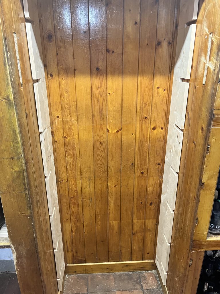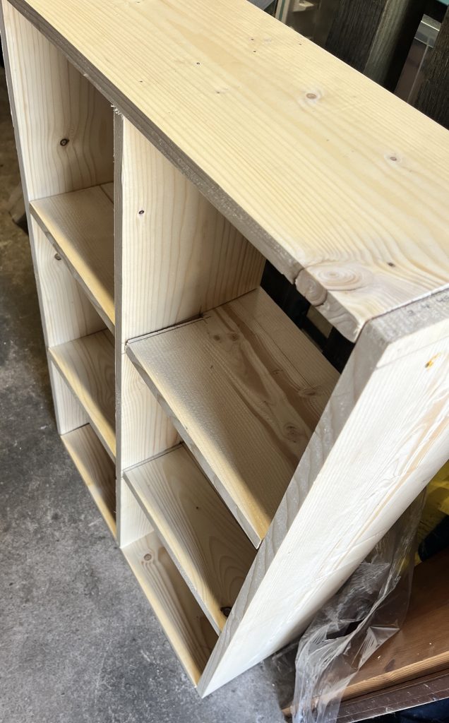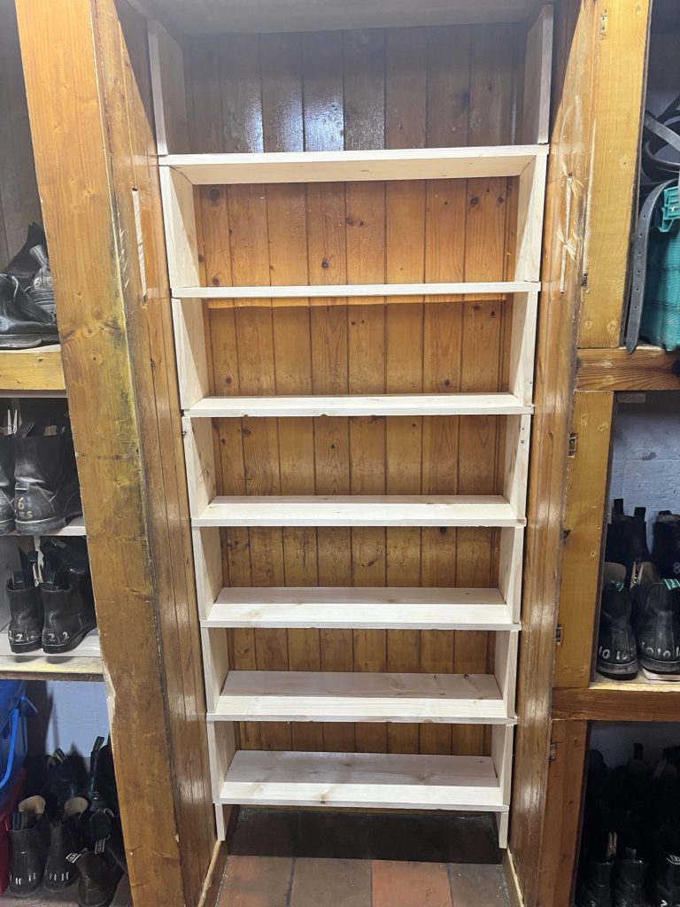 Due to the size, I made it so there would be a wider space in the middle of the three to accommodate the larger footwear. For now, I cut out the corners so that they would slot in and be of use until the next session. Time went fast, today, I was in a rush to complete the shelves and ready them for varnishing and filling. Next time, I will create the second skin (in front), but not before adding the uprights.