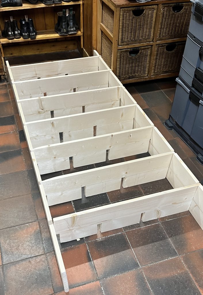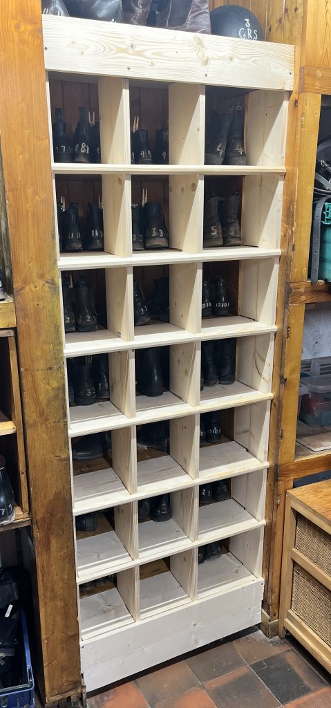 I opted to make this different to the first shelf setup, and with the pre-made module from last time being a bit of a dud, I went with another way. Putting the shelf notches back-to-back, meant that they would be fixed in place. I am pleased with this outcome. It was decided, in the week, that the right had side of the unit will now become the cupboards. So here’s to the next stage in the Tack Room saga.