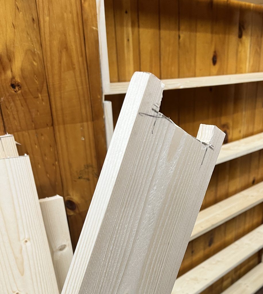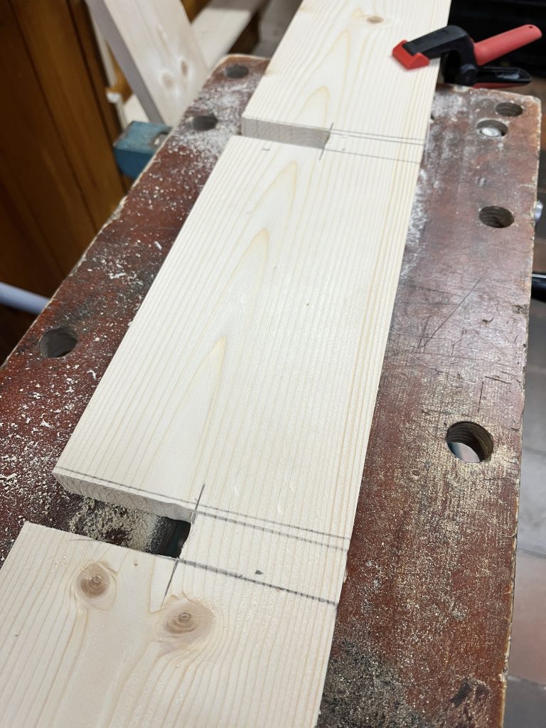 Making the shelf panels was hard work. I fastened them into the work bench and used my hacksaw to cut out the usual end pieces. I then had to cut out the notches for the uprights to go into. It was tough, but due to the spruce wood’s grain, I cut them down each side and snapped them off. A couple of them needed to have the last bits chiselled, to tidy them up.