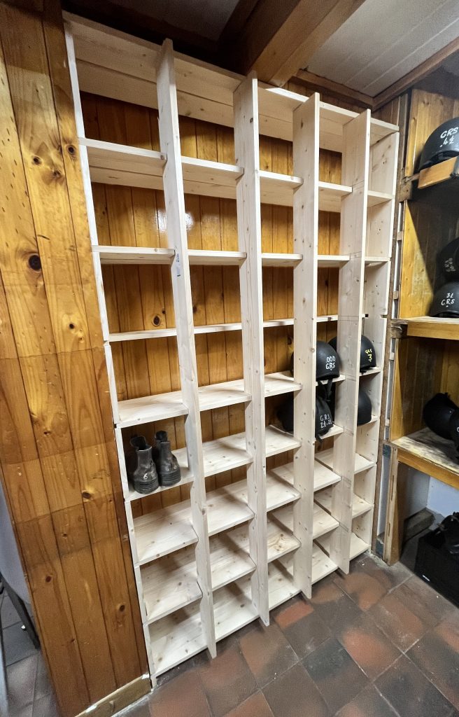 Another day of building was here and I made my way over to the stables. Between 10am and 3pm, I carried on the endeavour of pigeon-holing the boot shelves. This session was about making the front layer. With the rear layer ready for edging and varnishing, I used the sides of the front layer for measuring, ready to hand cut both horizontal and vertical sections.