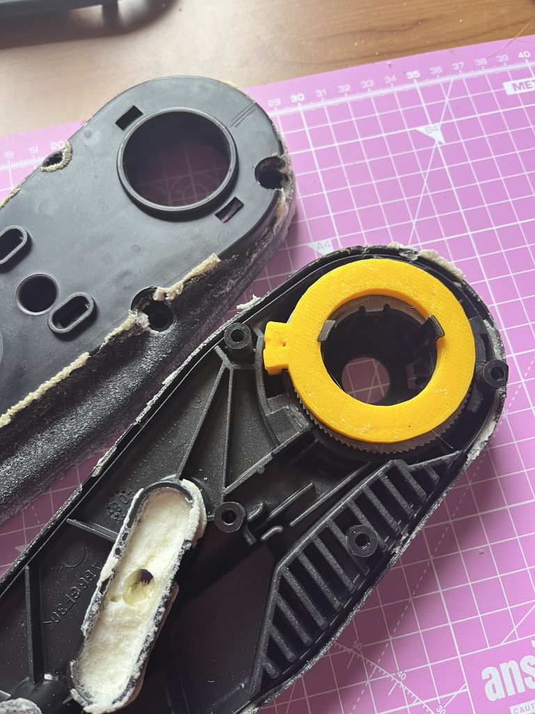 Version One: This was designed to stop the armrest either up or down. The print went well, but broke under the weight of my arm. It also struggled to slide, completely, onto the boss. I needed to plan a second version.